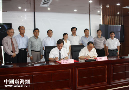 廣西林業(yè)產(chǎn)業(yè)行業(yè)協(xié)會與臺灣合板制造輸出同業(yè)公會簽訂合作備忘錄。(圖片來源:廣西臺辦)