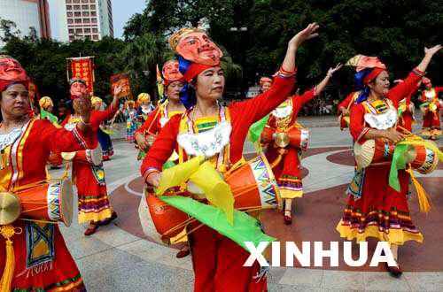 南寧市綠城之聲民俗慶典藝術(shù)團(tuán)的老年演員在表演壯族師公“岳”鼓舞。(2008年7月27日新華社記者 周華 攝)。