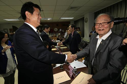 2月24日,在臺灣高雄,廣西代表(左)與臺方代表在簽約后握手。當日,桂臺漁業合作項目簽約儀式在高雄舉行,簽約合作項目6個,內容涵蓋冷鏈物流基地項目、觀光農業科研中心項目、優質肉牛品種研發項目合作意向書等,總投資額20多億元人民幣。新華社發