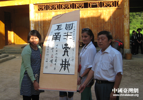 中國臺(tái)灣網(wǎng)7月19日黔南消息 日前,2012年臺(tái)胞青年夏令營貴州分營在黔南三都水族自治縣觀光考察結(jié)束,縣委統(tǒng)戰(zhàn)部受縣人民政府的委托、代表全縣30多萬水族人民,給全體營員贈(zèng)送了“中華兒孫萬年興”、“國興人壽年春”兩幅水書作品。臺(tái)胞帶隊(duì)老師呂素貞接到條幅表示,一定要珍惜,攜手并進(jìn),造福于子孫后代。(中國臺(tái)灣網(wǎng)黔南州臺(tái)辦通訊員 羅世云)