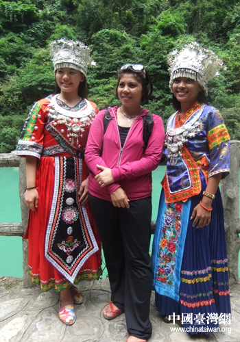 領(lǐng)隊(duì)呂素貞與兩“苗族少女”合影留念。(黔南州臺(tái)辦 張榮周 攝)