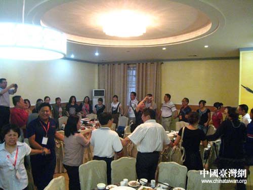 宴請聯歡會上,楊承志發表了熱情洋溢的祝酒詞,歡迎臺灣同胞的到來,讓大家共同度過美好難忘的“六月六”。臺灣少數民族教師參訪團盧曉玲女士激動地說,我們展示臺灣少數民族的歌與舞,讓大家共同分享節日的快樂。大家在熱烈的氣氛中,相互敬酒,敘民族情,歌唱布依族“好花紅”民歌,臺灣“我們都是一家人”,“手牽著手,肩并著肩……”,歡快地跳起了舞蹈,把聯歡會推向高潮。