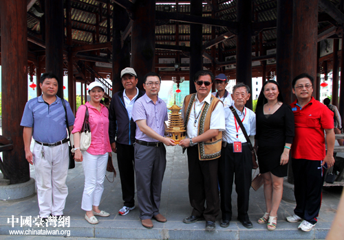 參訪團到“槍手部落”——岜沙參觀苗族風情的展示,與岜沙苗族村民交流,融入到濃厚的民族風情里。隨后,參訪團來到從江生態廣場,參觀了目前世界上最高的木質結構的從江侗族鼓樓。在鼓樓下,縣委常委、組織部部長、統戰部部長楊軍會見了孔文吉一行,并向參訪團贈送了具有民族特色的民間工藝品——小黃鼓樓,表達從江各民族對臺灣同胞的深厚友誼。孔文吉一行分別向縣人大、縣人民政府贈送 “友誼長存”的錦旗,表達了兩岸各民族的心愿和友情。