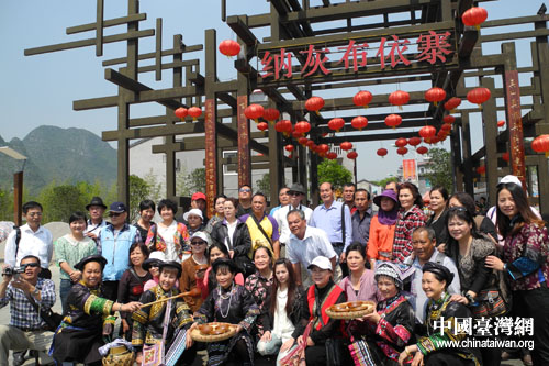 參訪團(tuán)一行在賽門前與穿著節(jié)日盛裝的布依同胞合影留念。(興義市臺(tái)辦 唐喜美 攝)