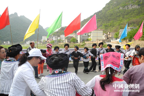 參訪團(tuán)一行與滴水村民載歌載舞,共唱《相親相愛一家人》。(興義市臺(tái)辦 唐喜美 攝)