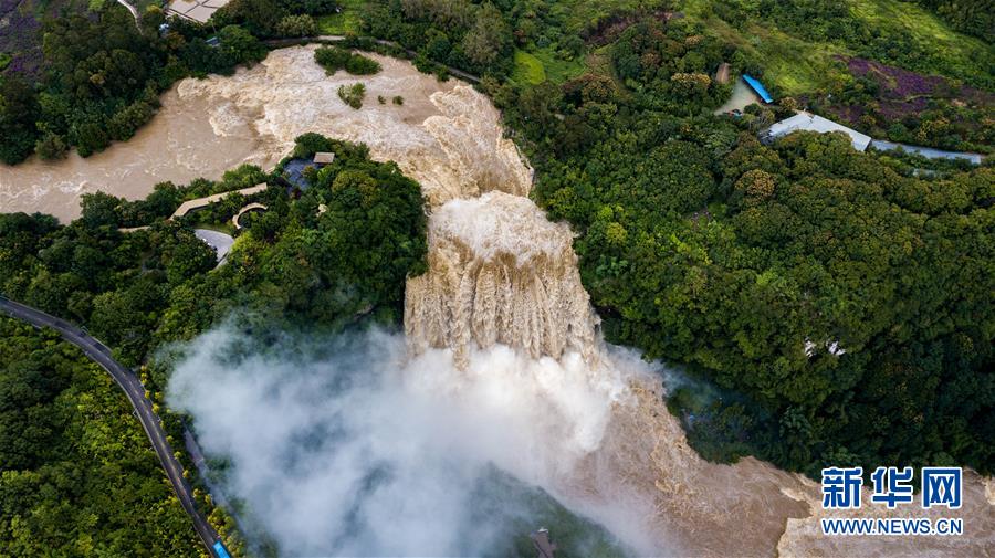 這是9月6日拍攝的黃果樹瀑布(無人機照片)。近日,受上游降雨影響,貴州黃果樹瀑布流量增大,水流飛瀉而下,蔚為壯觀。新華社發(陳熙 攝)
