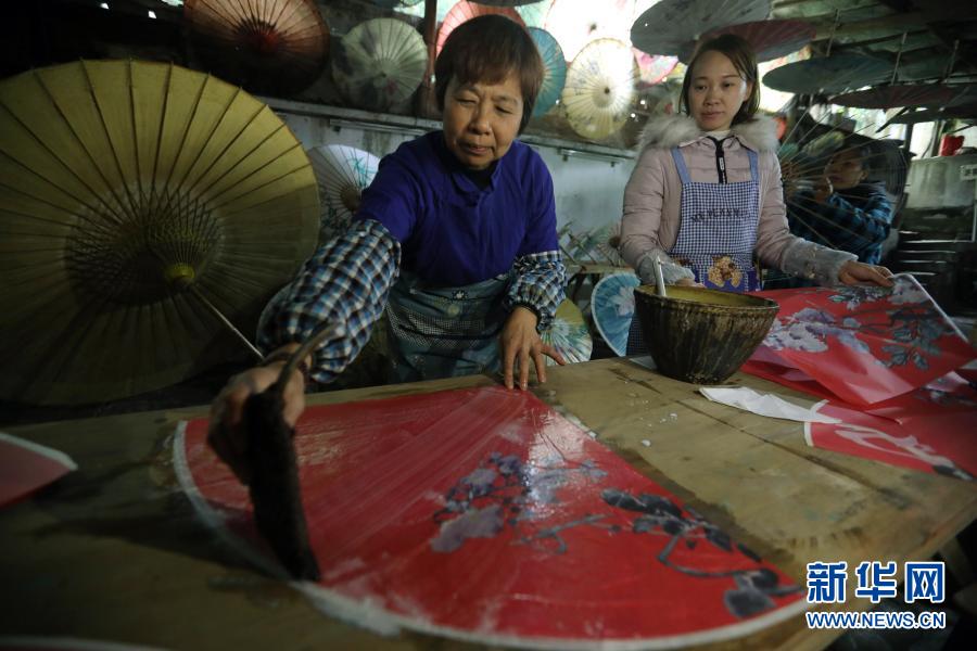 12月19日,在貴州省赤水市大同鎮,赤水油紙傘制作技藝傳承人李珍霞(左)在糊傘紙。