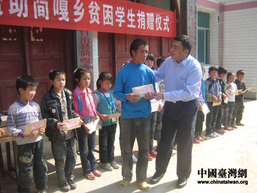 中國臺灣網12月8日鎮(zhèn)寧消息 日前,貴州省臺聯(lián)會長邱培聲、秘書長周飛月,在安順市委統(tǒng)戰(zhàn)部副部長、臺辦主任趙春模、臺辦副主任帥開立的陪同下,來到鎮(zhèn)寧縣大山深處的簡嘎鄉(xiāng),為這里的貧困學生帶來了臺商董淑貞女士的愛心捐款。