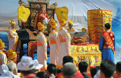 11月1日,湄洲媽祖文化旅游節(jié)上舉行祭典媽祖活動(dòng)。當(dāng)日,以慶祝媽祖信俗成功申報(bào)人類非物質(zhì)文化遺產(chǎn)為主要活動(dòng)內(nèi)容的第十一屆中國(guó)湄洲媽祖文化旅游節(jié)在媽祖故鄉(xiāng)福建湄洲島開(kāi)幕。來(lái)自海內(nèi)外26個(gè)國(guó)家和地區(qū)的萬(wàn)余名中華兒女齊聚湄洲島,圍繞“同謁媽祖,共享平安”的主題,舉行包括媽祖祭典、海峽媽祖文化旅游推介會(huì)和第五屆湄洲媽祖海峽論壇等內(nèi)容的活動(dòng)。新華社記者姜克紅攝