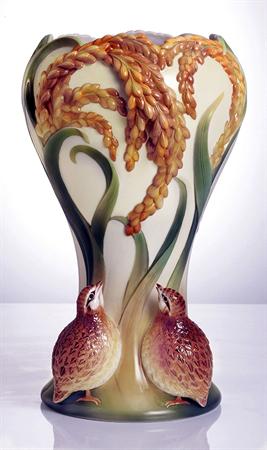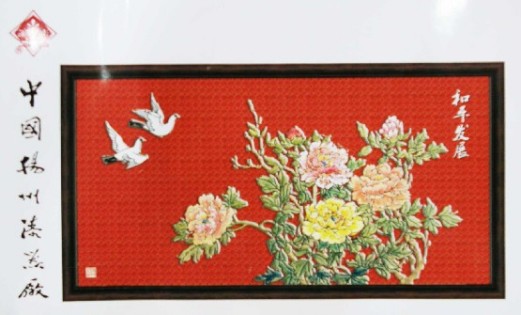 海基會表示,“安和升祥”紀念瓶,浮雕了兩只拙樸可愛的鵪鶉,仰望著上方結實、飽滿的兩串稻米。鵪鶉是古代繪畫常見的吉祥鳥獸;稻米結實累累,象征豐足的太平盛世。鵪鶉與稻禾相伴,取其諧音“安和”之意,代表對兩岸安定、和平的期盼。海協會贈給海基會的紀念品是揚州漆器畫作,名為“和平發展”。它以寶石及揚州漆器雕砌出一幅牡丹圖,陳云林說是“和平花”。