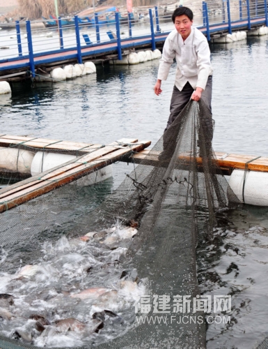 1月4日,一位連江漁民正在還上養殖漁排收網。據福建省海洋與漁業廳透露,2009年福建省對臺水產品出口創歷史新高,僅前11個月對臺水產品出口3.55萬噸,創匯2.08億美元,出口量、出口金額均居大陸各省首位。(張麗君 攝)