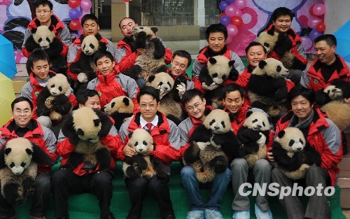 2月3日,16只大熊貓寶寶和工作人員一起合影。