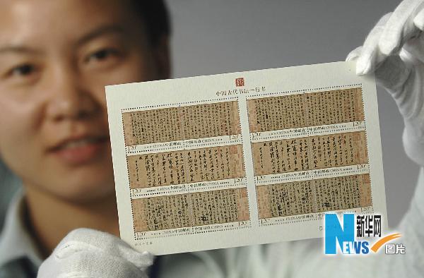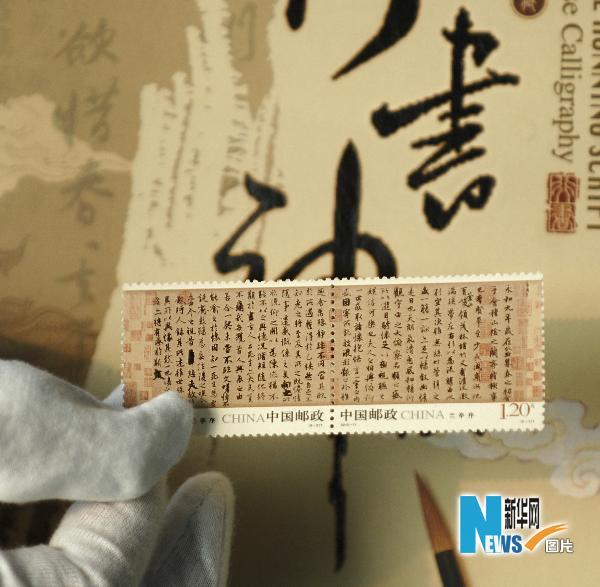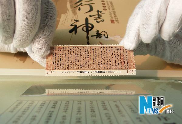 全球首套宣紙郵票《中國古代書法——行書》將于5月15日發行。該郵票一套6枚,內容選取了天下三大行書,分別為東晉書法家王羲之的《蘭亭序》、唐代顏真卿的《祭侄稿》和北宋蘇軾的《黃州寒食帖》,均為2枚連體郵票。這是繼“篆書”“隸書”“楷書”之后發行的又一套書法題材郵票,采用宣紙作為印刷材料,這在郵票印制史上尚屬首次。新華社發(趙軍 攝)