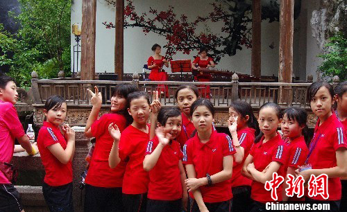 7月7日,臺灣百名小天使們參觀福州三坊七巷,圖為小天使們正在福州衣錦坊水榭戲臺品曲藝。小天使們大嘆水榭戲臺得天獨厚的音響效果,不用擴音器的古法音效。2010“陽光·海峽”兩岸快樂小天使活動營的百名小朋友們參觀福州三坊七巷。中新社發 張麗君 攝