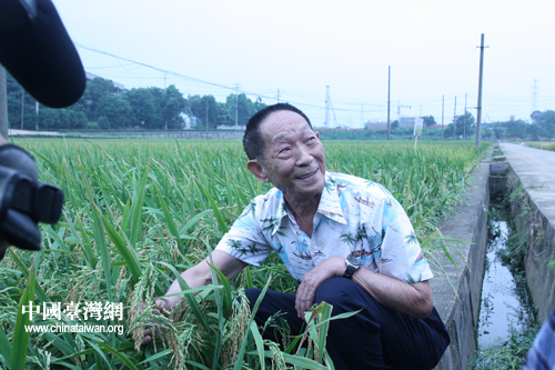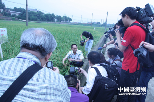 7月16日,兩岸記者聯合采訪袁隆平院士。圖為袁隆平在實驗田邊被兩岸記者熱情圍拍。(中國臺灣網 楊麗 攝)