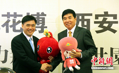 9月14日,臺北市市長郝龍斌與西安市市長陳寶根在臺北舉辦儀式,啟動兩市未來一整年的園藝接力與文化合作計劃。臺北市與西安市將在未來一年中次第舉辦花博會、世園會兩項重要的世界園藝博覽會,雙方將開展多項具體合作規劃。中新社記者 劉舒凌 攝