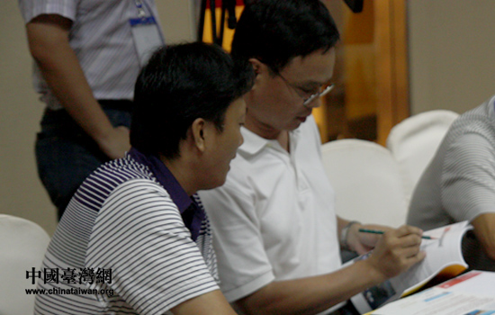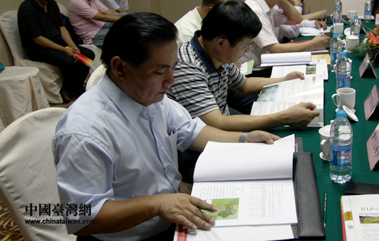 18日晚,第二屆兩岸鄉(xiāng)村座談舉行兩岸結(jié)對子鄉(xiāng)村見面會,兩岸30個鄉(xiāng)村代表參加。圖為參會代表在翻看結(jié)對子鄉(xiāng)村的有關(guān)資料。(中國臺灣網(wǎng) 張弛 攝)