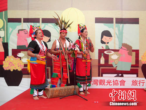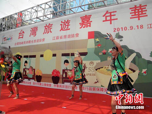 18日,臺灣海峽兩岸觀光旅游協會(簡稱臺旅會)在南京舉行“臺灣旅游嘉年華”。這是臺旅會在大陸首度舉辦的戶外嘉年華推廣活動。在此間上午的嘉年華盛會上,臺灣藝術家們熱情火辣的原住民歌舞表演,將現場氣氛推至高潮。