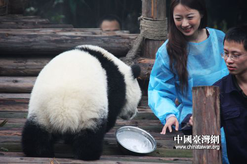 中國臺灣網10月20日成都消息 新近當選“熊貓守護使”的臺大美女模特王郁文在走馬上任之初便活動不斷。19日上午,王郁文出現在成都大熊貓繁育研究基地內部,與熊貓來了一次“親密接觸”。