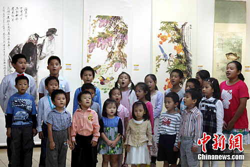 10月20日,由大陸中央文史研究館書畫院主辦的“大道同行——兩岸中國畫藝術展”在臺北“國父紀念館”開幕。圖為臺北市大安區讀經班的少年兒童在開幕式上背誦《論語》。中新社記者 陳立宇 攝