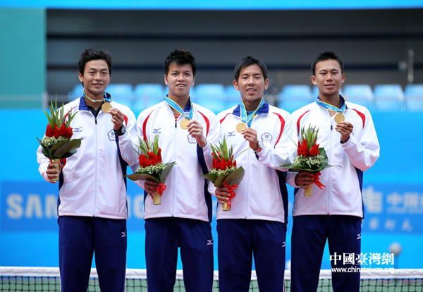 中華臺北隊男網團體選手披金,站上最高領獎臺。(中國臺灣網 鐘寶華 攝)