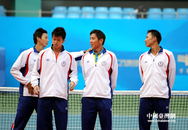 中華臺北隊男網團體領獎,圖為選手們互相整理衣領。(中國臺灣網 鐘寶華 攝)