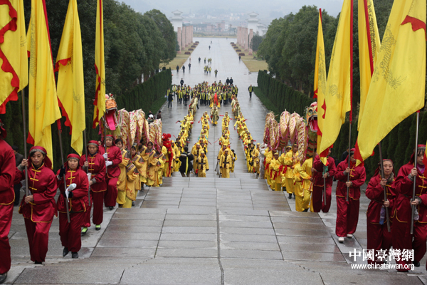 在全體肅立、擊鼓九通、鳴金九響、鳴炮奏樂、敬獻貢品(三牲、五谷、時鮮)后,湘籍后裔、臺北市議員黃珊珊作為主祭人向中華民族始祖炎帝虔誠敬香、敬獻花籃并三鞠躬。黃珊珊深情地宣讀了祭文,一句“湖湘子弟情系兩岸”感動了在場所有嘉賓。之后,臺灣嘉賓前往謁陵廣場舉行開午門謁陵儀式。