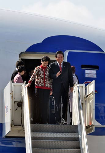 大陸海峽兩岸關系協(xié)會會長陳云林等人,20日中午搭機抵達桃園機場。陳云林直接下機,他向守候媒體及接機人員揮手。海峽交流基金會副董事長高孔廉等人前往接機,現(xiàn)場并有大批媒體守候。 “中央社”圖