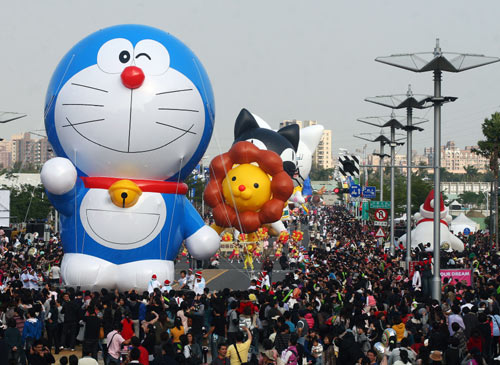 2011年高雄跨年晚會系列活動“大氣球游行”25日在高雄市時代大道舉行,現場有小朋友喜愛的卡通人物如哆啦A夢、海綿寶寶等參與游行,氣氛熱鬧。圖片來源:“中央社”