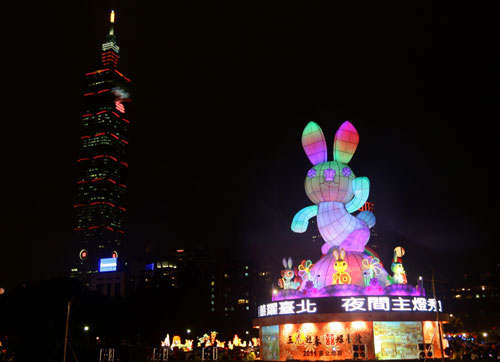 “2011臺北燈節”主燈“貝比”兔11日晚間正式點燈,搭配彩色鐳射水幕、水舞等表演,讓民眾欣賞絢麗的聲光主燈秀。圖片來源:“中央社”