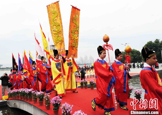 2月14日,以“弘揚臨水文化、促進兩岸交流”為主題的第四屆陳靖姑(福州)文化節在福州市南江濱公園九龍壁隆重舉行,吸引了來自兩岸各地近千名來賓及信眾同謁臨水夫人陳靖姑。圖為祭祀大典上的儀仗隊。中新社記者 劉可耕 攝