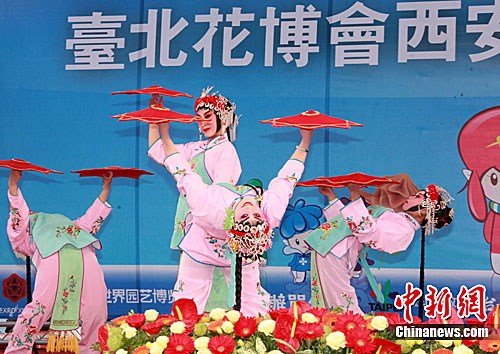 3月16日,臺北“西安文化日”活動在花博園區(qū)精彩登場。圖為西安藝人在活動日開幕式上表演戲曲雜技。中新社發(fā) 符永康 攝