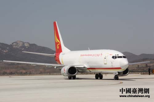 “繁星”、“點點”、“喜羊羊”、“樂羊羊”順利抵達威海機場。圖為飛機著陸后滑行。(中國臺灣網(wǎng) 劉海偉 攝)