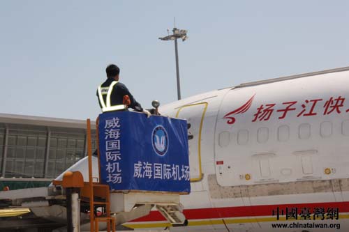 “繁星”、“點點”、“喜羊羊”、“樂羊羊”順利抵達威海機場。圖為機場地勤人員準備接“寶貝”們下飛機。(中國臺灣網(wǎng) 劉海偉 攝)