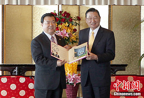 安徽省長王三運率領的“安徽經貿文化寶島行”參訪團,4月18日午間抵達臺北,將展開為期8天的交流活動。圖為王三運(左)抵臺后,在臺北圓山飯店會見臺灣海基會董事長江丙坤。中新社發 路梅 攝