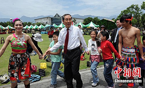4月25日,率廣西經(jīng)貿(mào)文化代表團(tuán)訪問臺(tái)灣花蓮縣的廣西壯族自治區(qū)主席馬飚和當(dāng)?shù)孛癖娛掷痔饒A圈舞,場面十分歡快。中新社發(fā) 林艷華 攝
