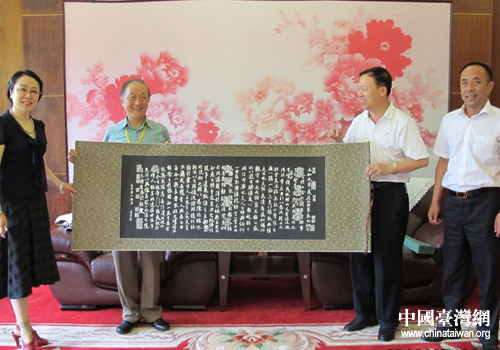 趙東巖向郁慕明贈送了《蘭亭序》剪紙畫。郁慕明對剪紙畫給予高度評價,并表示非常的感謝。本溪水洞的鐘克處長拿出了郁慕明上次來本溪水洞題詞的照片“本是水同源。溪在洞中流”送給郁慕明。