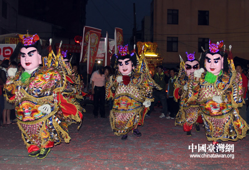 中國臺灣網4月4日臺南消息 鑼鼓喧天、鞭炮齊鳴,臺南近30家關廟用當地特色的民俗,恭迎山西運城明朝關公圣像駐駕臺南鹽水武廟。跳《江南style》的電音三太子、秀鋼管舞的臺南辣妹、放大陸流行的《最炫民族風》的花燈車隊等,讓巡游現場“嗨翻天”。