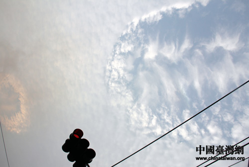 關公祖廟圣像巡游途中,臺南鹽水鎮上空出現奇特的云朵。(中國臺灣網 李典典 攝)