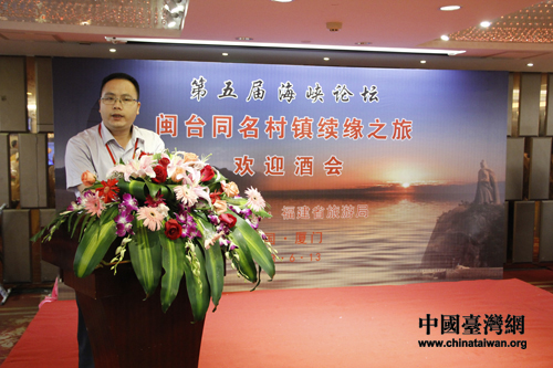 來自福建泉州市晉江安平鎮(zhèn)的代表張勝利在“閩臺(tái)同名鄉(xiāng)鎮(zhèn)續(xù)緣之旅啟動(dòng)儀式”上致詞(中國臺(tái)灣網(wǎng)記者 蕪?fù)?攝)