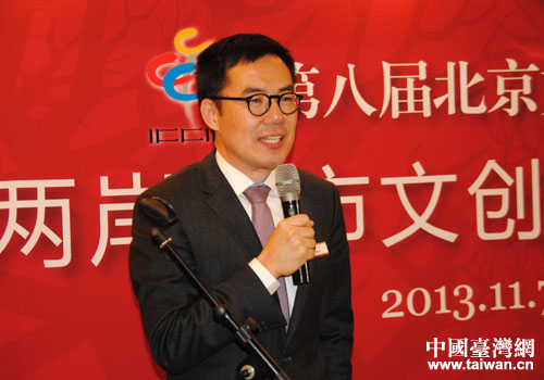 臺灣文創參訪團團長、臺北市文化局長劉維公在第八屆北京文博會兩岸城市文創交流酒會上致辭。(中國臺灣網北京通訊員 郭寧 攝)