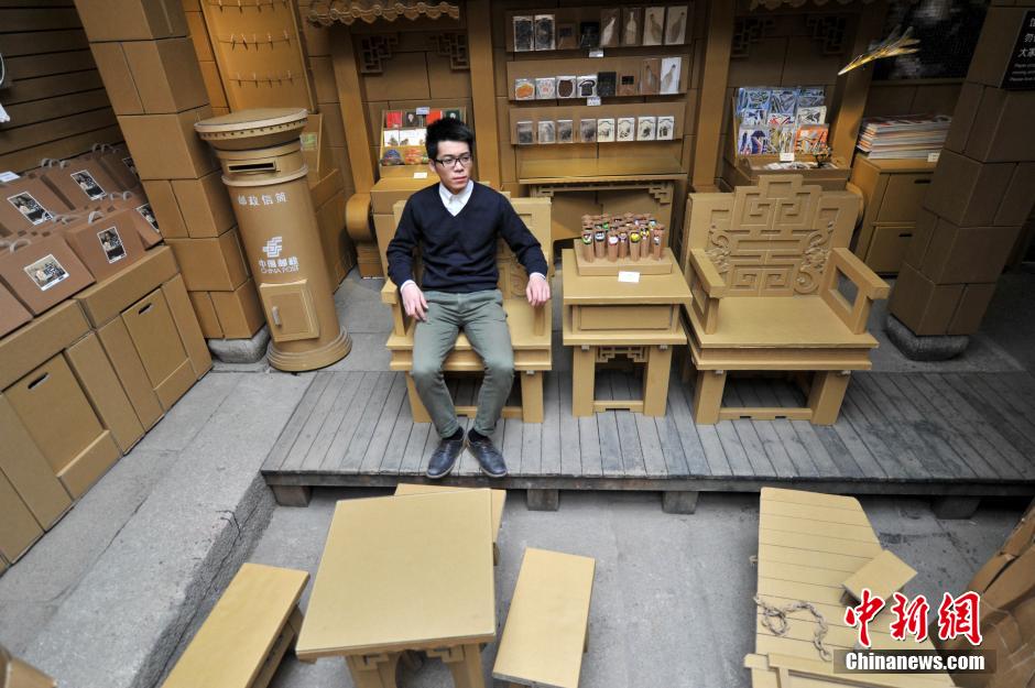 12月23日,福建首家臺灣紙箱王創意園落戶福州三坊七巷,創意園里結合了福州三坊七巷各個景點,打造一個夢幻的紙世界。圖為民眾體驗紙制桌子,可承受300斤重力。呂明 攝