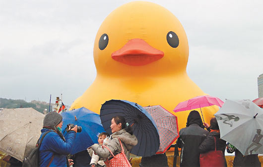 大黃鴨從去年12月21日在基隆展出后,今天下午在微風細雨中謝幕,活動發(fā)起人黃景泰在致詞時,感性地寫下謝幕詞,代表他50天來的心情寫照:“在風雨中進港,在平靜中返航,大黃鴨在基隆佇留的50天始終淡定,無視身軀的傷痕和塵埃,用它單純的心靈,散發(fā)溫柔的力量,我們用感恩的心,把快樂幸福傳遞給大眾,我們用謙卑的心,接受所有的批判,大黃鴨讓我們看清自己,面對挑戰(zhàn),迎接未來”。(中國臺灣網(wǎng) 朱煉)