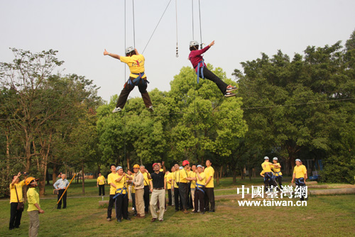 兩岸校長在東莞臺商子弟學(xué)校生命力營地體驗團(tuán)隊互助協(xié)作。 (中國臺灣網(wǎng)發(fā) 王羽威攝)