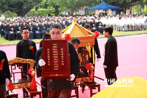 成年禮大典現(xiàn)場,東莞臺商子弟學(xué)校董事長葉宏燈親自護(hù)送中華民族始祖炎帝神位。 (中國臺灣網(wǎng)發(fā) 王羽威攝)