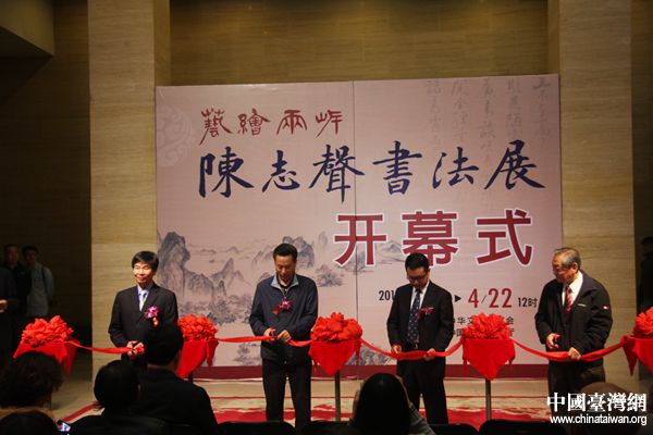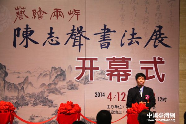 中國臺灣網4月13日北京消息 4月13日下午,以“藝繪兩岸”為主題的“石溪畊硯,翛墨京華——陳志聲書法作品展”開幕式在中國美術館成功舉行。文化部港澳臺辦主任助理、中華文化聯誼會副秘書長李保宗、文化部港澳臺辦臺灣處處長廖冰、中國美術館黨委書記游慶橋、臺灣中國書法家協會理事長陳炫明、臺灣著名書法家陳志聲及其夫人等兩岸書法愛好者共同出席了開幕儀式。