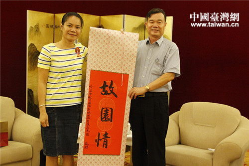 9月22日下午,海南省政協副主席王應際接見參加“回娘家慶中秋——海南新娘回鄉省親交流活動”的在臺瓊籍新娘省親團一行。圖為海南省政協副主席王應際和參加本次活動在臺瓊籍海南新娘互贈禮物 (中國臺灣網 郜利敏 攝)