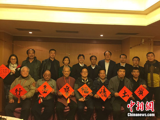圖為陳逢顯(前排左3)與甘肅慶陽文博參訪團成員合影。前排左4為團長閻曉峰。全體人員手持書法家現場所寫春聯,有迎接新年到來的溫馨氣氛。