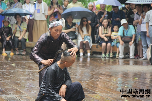 岜沙人的絕技鐮刀剃頭(中國臺灣網 蕪同 攝)