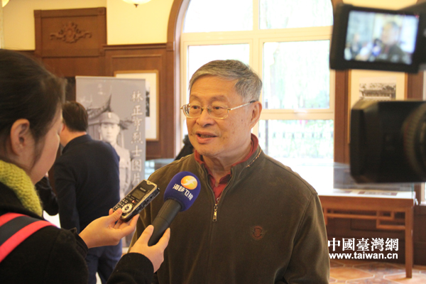 林正亨烈士家屬代表、林正亨長子、北京林獻堂抗日事跡陳列館館長林為民接受記者采訪。(中國臺灣網 吳怡 攝)